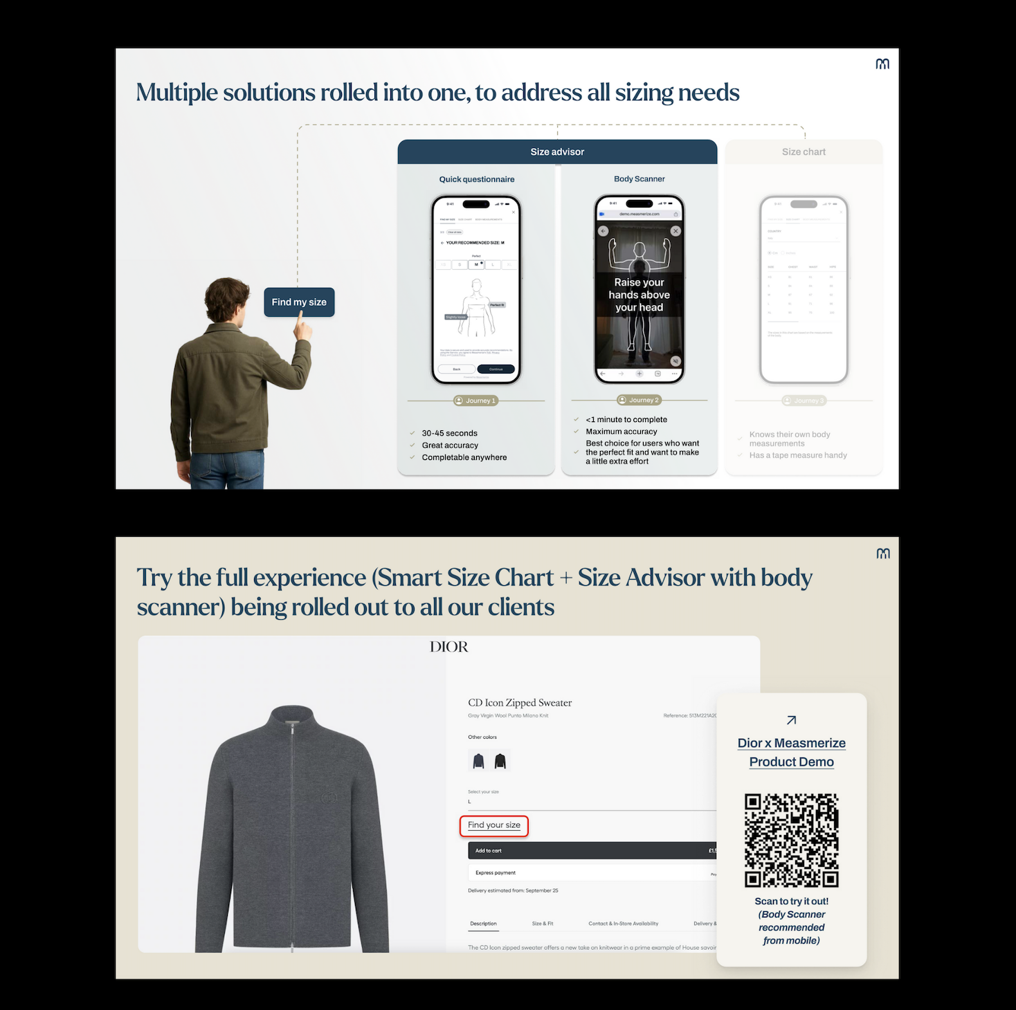 - Measmerize manages ecommerce sizing at 360 degrees for fashion e-commerce. Through our Size Hub, which is composed of an SKU-level size chart and our AI Size Advisor with optional body scanner, we cater to all of the consumer's sizing needs. Conversion rates are 5-10% higher (overall, measured via A/B testing), and return rate of Measmerize users -40%. Already trusted by LVMH, Richemont, Prada Group, Moncler, Stone Island, Ferragamo, Golden Goose, Tod's Group, Tom Ford, Zimmermann, Zegna, Santoni, ...