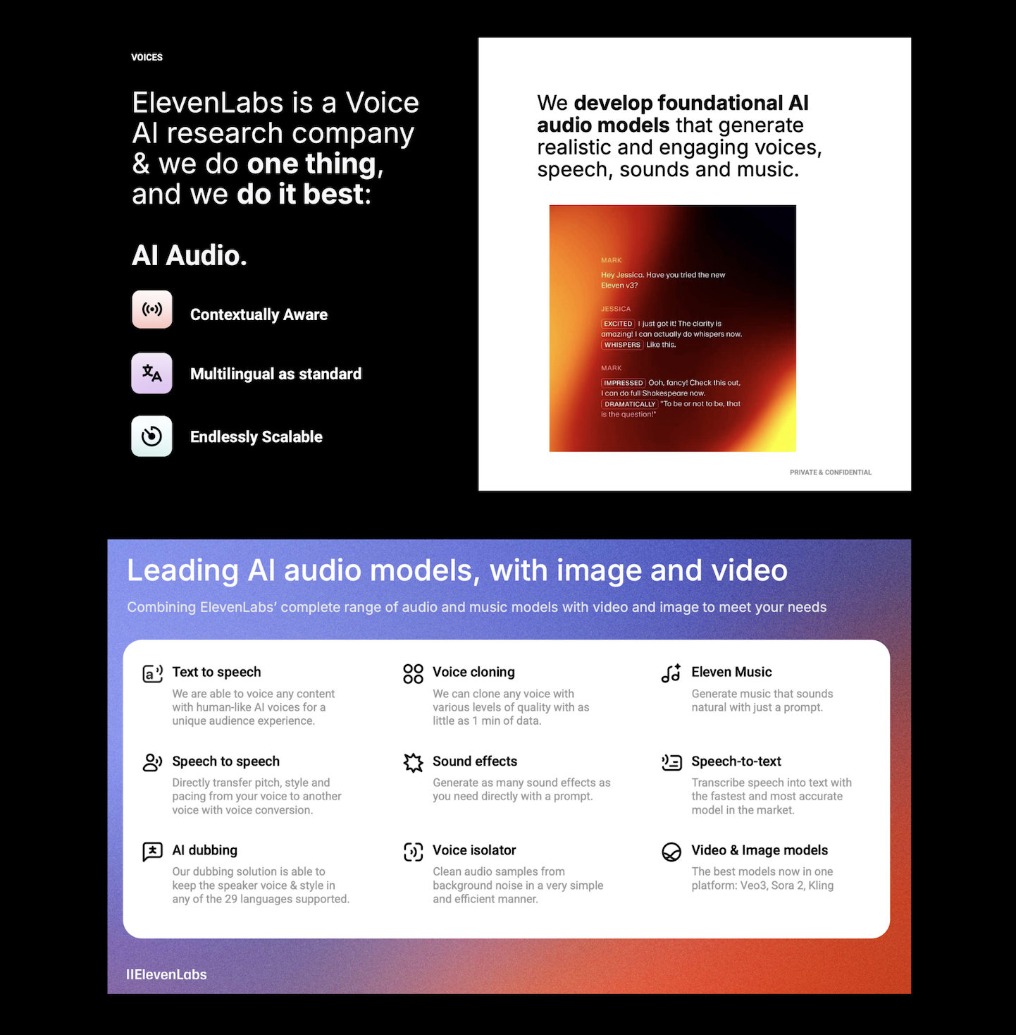 - ElevenLabs is a creative AI audio platform built to support every stage of luxury brand marketing and customer engagement. We enable global maisons to express a distinctive, consistent brand voice across markets: combining creative excellence with scale. From dubbing campaign videos in any language to crafting bespoke voice identities that embody brand heritage, tone, and emotion, ElevenLabs ensures every audio touchpoint feels intentional and refined. Our platform also supports the creation of original music and soundscapes for advertising, elevating storytelling across digital, social, and in-store experiences. Beyond creation, ElevenLabs powers next-generation customer experience through our Agents platform. Luxury brands can deploy AI-powered personal shopping assistants that deliver highly personalized, brand-aligned interactions: guiding clients, answering questions, processing orders, and supporting after-sales service. Available 24/7 and fluent in every major language, these agents extend the white-glove experience globally, without compromise. For groups like Kering and its Maisons, ElevenLabs provides the infrastructure to scale creativity, personalization, and service, while preserving exclusivity, trust, and brand integrity.