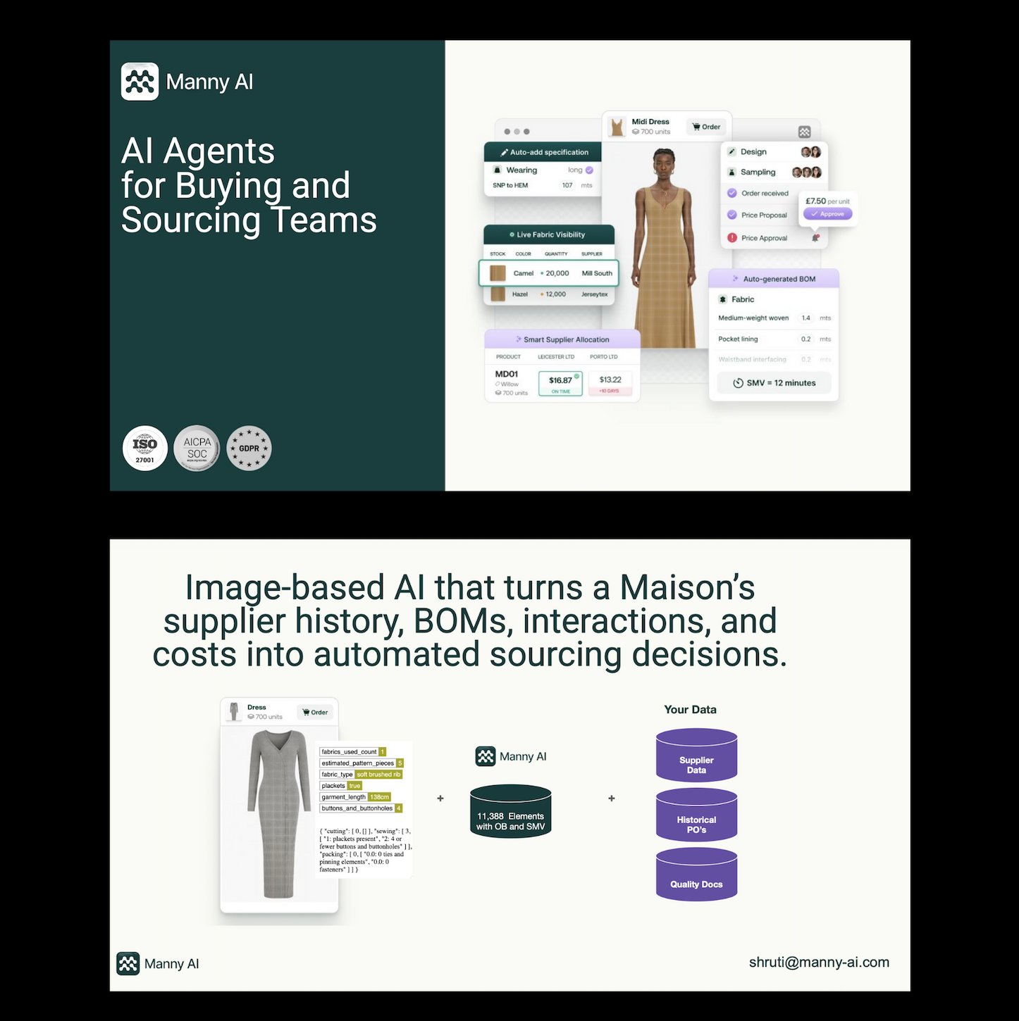 - MannyAI enables brands to make faster, more confident sourcing and production decisions by bringing AI to supplier management. Our platform transforms historical data and real-time supplier insights into actionable recommendations across costing, negotiation, and allocation. Design and sourcing teams can assess commercial viability early through AI-driven predictive pricing, align on open costing using auto-generated Bills of Materials and Bills of Labour, and allocate styles to the most suitable suppliers based on proven capability, capacity, material availability, and lead times—reducing manual coordination and shortening development cycles.