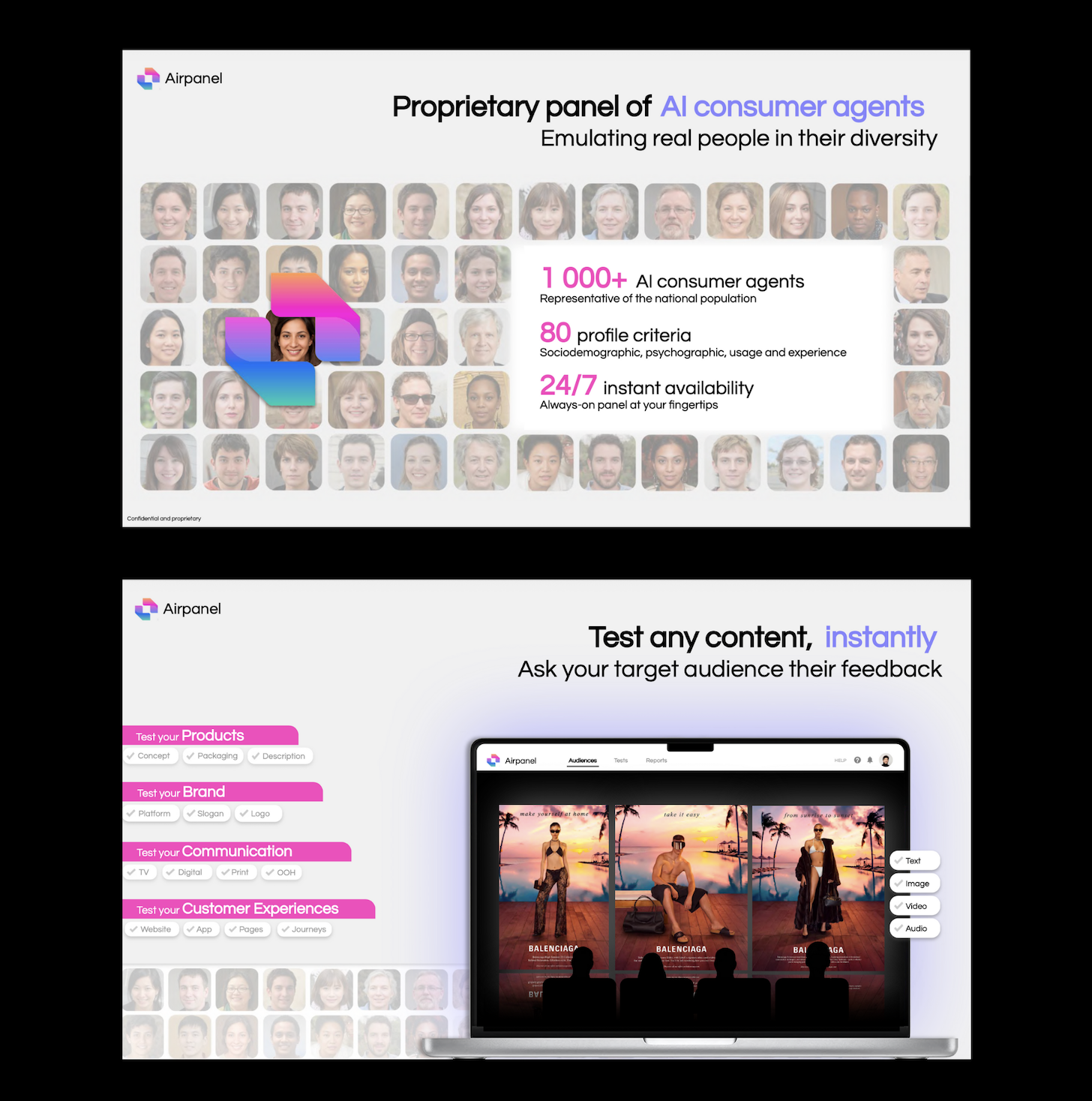 - The challenge: In the fast-paced luxury market, 90% of brand content goes live without pre-testing. Traditional research methods are often too slow and costly for day-to-day operational decisions, forcing teams to rely solely on intuition and increasing the risk of market disconnect. Our value proposition: Airpanel is the first "Augmented Empathy" platform that turns weeks of consumer feedback into minutes. We provide Maisons with a private, secure environment to "mirror-check" their creative intuitions against hyper-realistic AI audiences. We help you predict exactly how a campaign, concept, or product will resonate, allowing you to take creative risks with confidence. Key Features: Hyper-realistic simulation: Access a panel of 1,000+ AI consumers, each defined by 80+ socio-demographic and psychographic attributes to mirror the complexity of human reaction. Full-spectrum testing: From initial storyboards and concepts to final images and videos, test any asset instantly. Deep insights in <15 minutes: Receive detailed reports combining qualitative verbatim, emotional analysis, and strategic recommendations instantly.